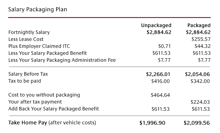 *Example calculated on a $30,000 purchase price of new vehicle, leased over 3 years, travelling 15,000 kilometres per year for Employee earning $75,000 ($2,884.62 before tax per fortnight) gross salary.